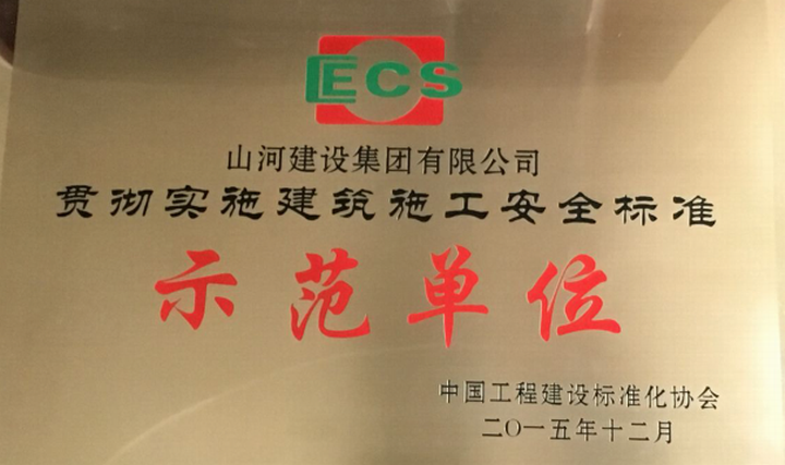2015年12月,中國工程建設(shè)標(biāo)準(zhǔn)化協(xié)會施工安全專業(yè)委員會召開了貫徹實(shí)施建筑施工安全標(biāo)準(zhǔn)示范單位表彰大會,山河集團(tuán)榮獲“2015年度全國貫徹實(shí)施建筑施工安全標(biāo)準(zhǔn)示范單位”榮譽(yù)稱號。