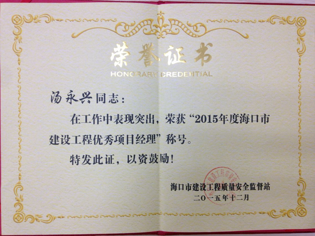 1月22日,??谑匈|(zhì)量安全監(jiān)督站劉勇一行領(lǐng)導(dǎo)來到新城吾悅廣場項目部頒發(fā)??谑小?015年度優(yōu)秀項目經(jīng)理”獎,項目經(jīng)理湯永興榮獲“優(yōu)秀項目經(jīng)理”榮譽稱號。項目參建各方對項目經(jīng)理湯永興表示熱烈祝賀,并充分肯定了湯經(jīng)理為項目部做出的努力和貢獻。