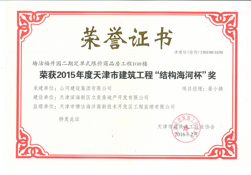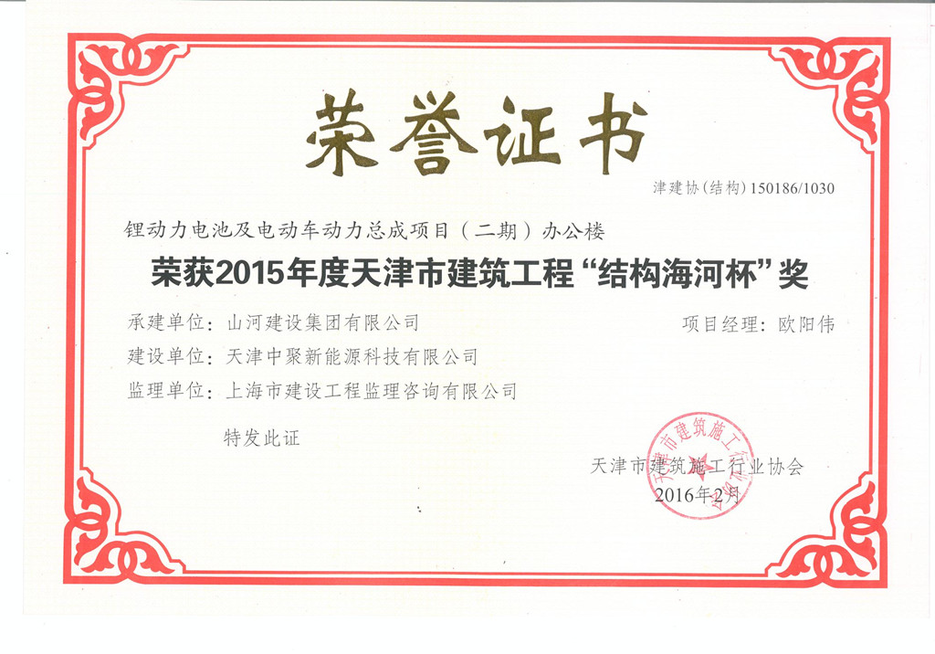 1月29日,天津市建筑業(yè)協(xié)會(huì)正式公布了2015年度“天津市結(jié)構(gòu)海河杯獎(jiǎng)”評(píng)選結(jié)果。由山河集團(tuán)天津公司承建的鋰動(dòng)力電池及電動(dòng)車(chē)動(dòng)力總成項(xiàng)目(二期)1#~4#車(chē)間及辦公樓工程和塘沽福升園二期定單式限價(jià)商品房工程7#~10#樓同時(shí)獲此殊榮。這是山河集團(tuán)進(jìn)入天津市場(chǎng)以來(lái),首次獲得天津市建設(shè)工程質(zhì)量方面的最高榮譽(yù)獎(jiǎng)。