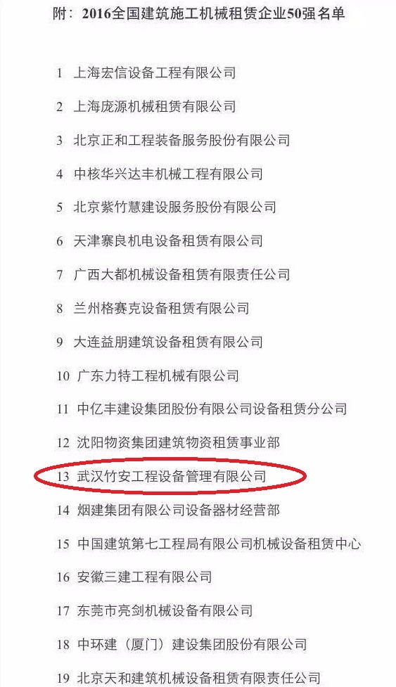 7月15日,由中國建筑業(yè)協(xié)會機(jī)械管理與租賃分會組織開展的“2016年全國建筑機(jī)械50強(qiáng)”評選活動揭曉。武漢竹安設(shè)備管理有限公司再度榮獲“全國建筑施工機(jī)械租賃50強(qiáng)企業(yè)”榮譽(yù)稱號,位列第13名。