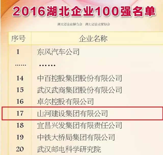 9月8日,2016湖北企業(yè)100強(qiáng)發(fā)布,東風(fēng)汽車(chē)、中建三局、武鋼集團(tuán)位居前三甲,山河集團(tuán)以304.85億元的營(yíng)業(yè)收入排名第17位,榮登湖北企業(yè)百?gòu)?qiáng)榜。
