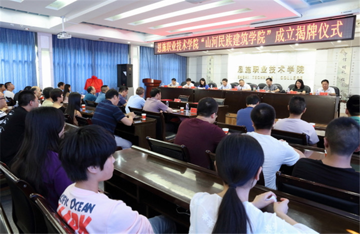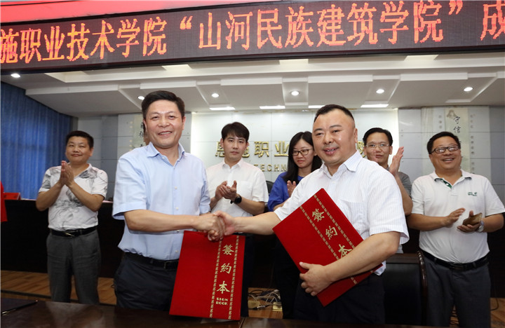 會上,恩施職業(yè)技術(shù)學院院長張捷致辭;山河集團人力資源總監(jiān)李穎宣讀校企合作辦學協(xié)議書;集團董事長程理財與恩施職業(yè)技術(shù)學院院長張捷進行聯(lián)合辦學現(xiàn)場簽約,并共同為“山河民族建筑學院”揭牌。