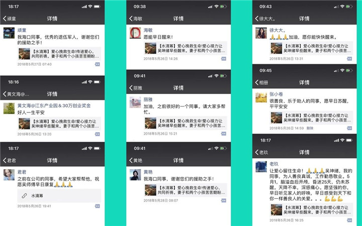 他的遭遇牽動(dòng)著海南公司原同事們的心。海南公司員工紛紛自發(fā)為他募捐,并爭(zhēng)相用微信轉(zhuǎn)發(fā)他的病情,集團(tuán)員工朋友圈一度被自發(fā)援助吳坤緒的愛(ài)心舉動(dòng)刷屏。