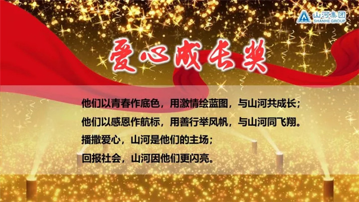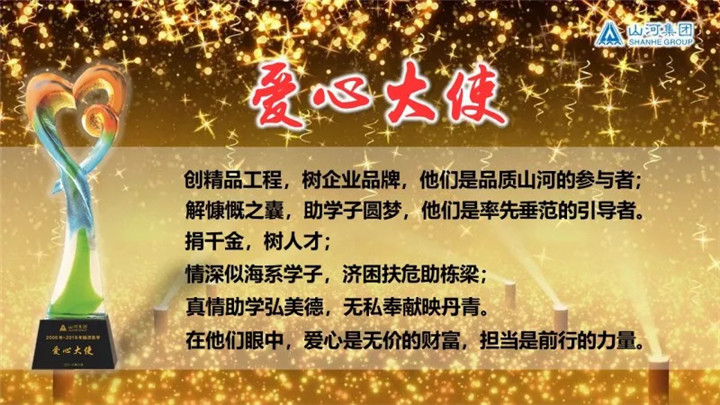答謝宴現(xiàn)場還給“全體山河人”頒獎,這個獎,看似平實,但意義非凡。年年金秋開學(xué)季,每當(dāng)集團的捐資助學(xué)倡議書發(fā)出,無論天山河海,萬水千山,都阻擋不了山河人愛的腳步,全體山河人都會發(fā)起一股巨大的能量――奉獻愛,齊出發(fā)。
