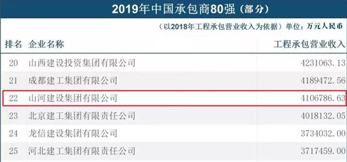 11月8日,美國《工程新聞記錄》(ENR)和中國《建筑時報》聯(lián)合發(fā)布2019年度“中國承包商80強(qiáng)和工程設(shè)計企業(yè)60強(qiáng)”榜單。山河集團(tuán)再次榮登中國承包商80強(qiáng)排行榜,名列第22位,這是集團(tuán)連續(xù)第7次上榜,也是湖北省唯一上榜的建筑企業(yè)。