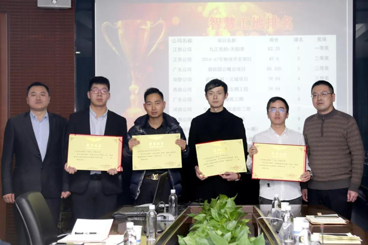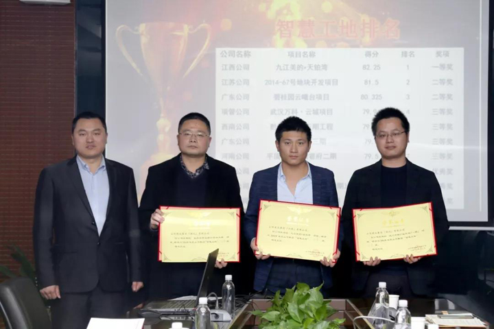 江西公司九江美的•天鉑灣項目榮獲智慧工地一等獎;江蘇公司2014-67號地塊開發(fā)項目、廣東公司碧桂園云曦臺項目榮獲智慧工地二等獎;項目管理公司武漢萬科·云城項目、西南公司黔江碧桂園五期工程、廣東公司美的翰湖苑三期工程、河南公司平頂山恒大珺睿府二期工程榮獲智慧工地三等獎;江西公司九江美的•國賓府項目、湖北公司武穴市棚戶區(qū)改造項目(一期)、湖北公司宜昌自貿(mào)區(qū)綜合服務大樓項目榮獲智慧工地優(yōu)秀獎。
