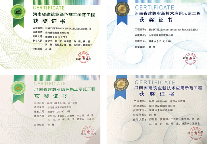 公司承建的恒大金碧天下項(xiàng)目、融創(chuàng)融園項(xiàng)目分別榮獲河南省綠色施工示范工程、河南省新技術(shù)應(yīng)用銅獎(jiǎng)各1項(xiàng)。這兩個(gè)項(xiàng)目在滿足立項(xiàng)要求后積極準(zhǔn)備立項(xiàng)工作,施工過程中嚴(yán)格按照《河南省建筑業(yè)綠色施工示范工程管理辦法(試行)》《河南省建筑業(yè)新技術(shù)應(yīng)用示范工程管理辦法》的要求,堅(jiān)持高標(biāo)準(zhǔn)建設(shè),確保高質(zhì)量完工,及時(shí)收集并準(zhǔn)備評(píng)審資料,順利通過了評(píng)審。