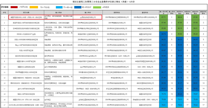 近日,在深圳市福田區(qū)建筑工務(wù)署組織的第三方安全巡查評估中,山河建設(shè)集團深圳公司承建的福田區(qū)外國語學(xué)校小學(xué)部項目綜合評分名列第一。