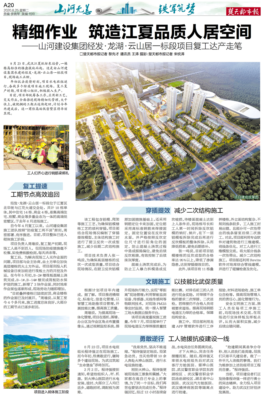 8月25日,《楚天都市報》“山河無恙 ?鐵軍筑夢”特刊刊發(fā)了山河建設(shè)集團項目管理公司經(jīng)發(fā)·龍湖·云山居一標(biāo)段項目復(fù)工達產(chǎn)的采訪報道。這是繼6月18日刊發(fā)湖北公司相關(guān)報道后,楚天都市報再次聚焦集團建設(shè)一線。在疫后重振的關(guān)鍵時期,集團各項目部正“火力全開”加快施工進度,全力以赴推動項目如期建成。