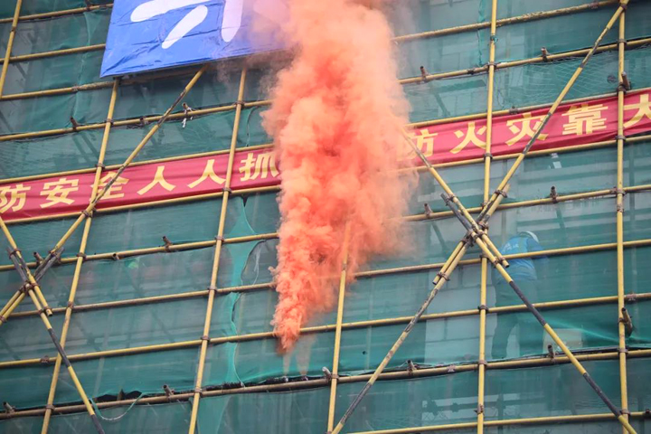 “失火了!”一陣急促的喊聲打破了施工現(xiàn)場(chǎng)的平靜,一股“濃煙”從正在建設(shè)的樓棟里冒出,形勢(shì)緊急。“立即啟動(dòng)應(yīng)急救援預(yù)案!應(yīng)急小組各就各位!”隨著項(xiàng)目經(jīng)理一聲令下,“事故現(xiàn)場(chǎng)”迅速展開救援……