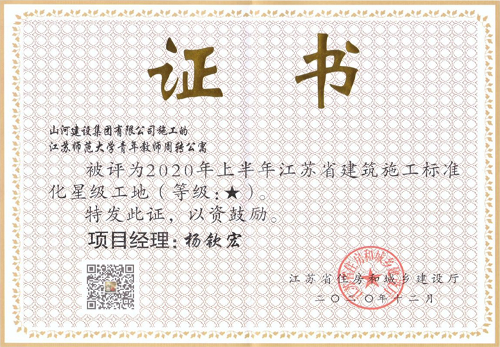 近日,從江蘇省住房和城鄉(xiāng)建設(shè)廳傳來喜訊,山河建設(shè)集團江蘇公司承建的江蘇師范大學(xué)青年教師周轉(zhuǎn)公寓工程被評為“2020年上半年江蘇省建筑施工標(biāo)準化星級工地”,再添一項省級榮譽。