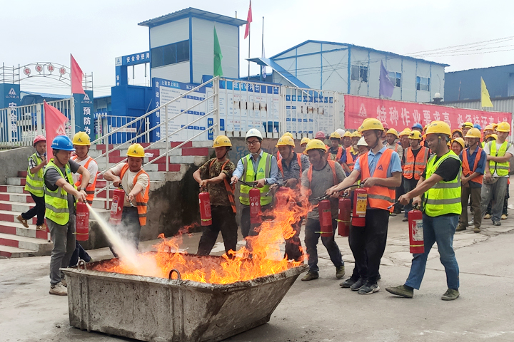 活動現場,項目管理人員、勞務施工人員整齊列陣,相關負責人講解了有關火災現場的應急處置方案,滅火器的原理、基本操作方法、注意事項等。演練人員按照預案,使用水槍、滅火器對“起火點”進行滅火操作,熟練掌握了消防器材的使用方法。