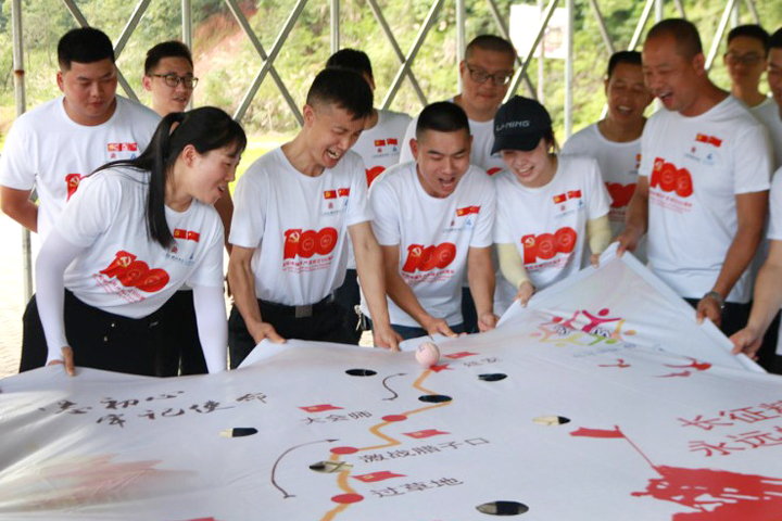 接下來,大家同聲齊唱《沒有共產(chǎn)黨就沒有新中國》,嘹亮的歌聲盡顯豪邁氣勢,燃起濃濃的愛國熱情。參訓(xùn)人員分成6隊,并制定了隊歌、隊徽、隊旗、隊伍造型,正式開始比拼。在“長征”拓展訓(xùn)練中,隊員們再一次熟悉了黨史,感受長征之路的曲折艱難,重溫新中國成立以來的重大事件,激發(fā)了奮勇爭先的干事創(chuàng)業(yè)熱情。