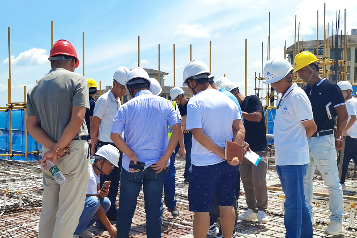 接下來,參訓(xùn)人員前往施工現(xiàn)場參觀操作層,實地了解了裝配式疊合板施工的工藝流程,技術(shù)人員對安裝過程中的關(guān)鍵點一一進行了講解。交流環(huán)節(jié),大家就供應(yīng)商的考察選擇、總體施工安排、施工工藝重難點、安全文明施工要求、工效及實際操作等方面進行了熱烈討論。