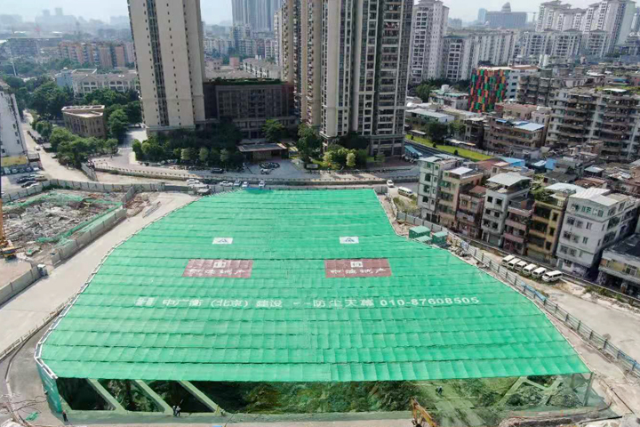 石崗路項目位于廣州市海珠區(qū)石溪村得寶球場旁,鄰近地鐵10號線石溪站,總建筑面積約6.5萬平方米,包括3棟36層、建筑高度116.2米的高層住宅。工程周邊環(huán)境復雜、裸土面積大、施工工序多,大跨度防塵天幕系統(tǒng)的啟用,開創(chuàng)了廣州基坑工程“全封閉”施工的先河。