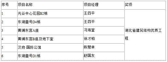 2008年4月9日,《湖北日報》第六版專版刊登《湖北省建設工程質量安全協(xié)會公告》。根據(jù)《湖北省建筑結構優(yōu)質工程評審辦法》,湖北省建設工程質量安全協(xié)會組織開展了2007年度省建筑結構優(yōu)質工程評選活動,經(jīng)對申報工程初審、核查和省建筑優(yōu)質工程評審,全省有323項工程榮獲2007年度湖北省建筑結構優(yōu)質工程獎,其中,山河集團有光谷中心花園、東湖壹號、黃埔東宮、漢府?國際公館等6項工程獲此獎項。具體如下表: